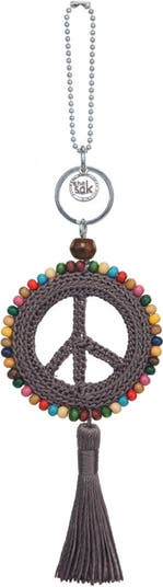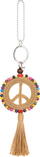 Hand-crocheted with wooden bead detail, this dangle features a classic peace sign with a fabric tassel and daisy chain closure. Add it to any one of our bags for a special touch.