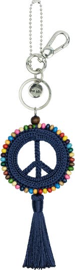 Hand-crocheted with wooden bead detail, this dangle features a classic peace sign with a fabric tassel and daisy chain closure. Add it to any one of our bags for a special touch.