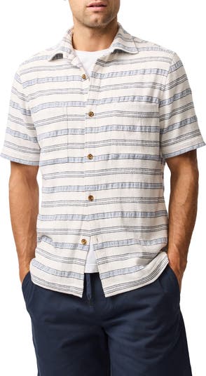 Subtle texture meets easy comfort in this short-sleeve button-up, where yarn-dyed stripes bring artisanal character to the recycled cotton-blend fabric’s airy drape.