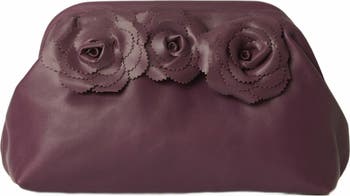 This stylish leather clutch features beautiful flower detailing and a flat bottom. Dog clip closure.