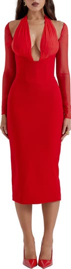 Feel like the life of the party in this plunging midi dress designed with a signature corset-inspired bodice on a body-con silhouette framed by long sleeves.