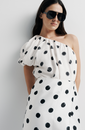 One-shoulder top with exaggerated sleeve and sculpted folds. Crafted in soft viscose with spot print by artist Anne Marie Jackson.