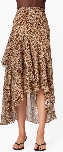 Swirled in ruffles and offered with an off-center hemline, this charming skirt is easy to style up or down.