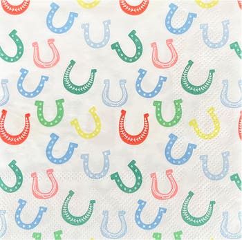 Calling all cowboys! Our "Yeehaw" Collection has everything you need to gear up for your next rodeo. This adorable petite napkin features a horseshoe pattern shades of blue, green, and red.