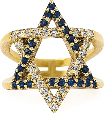 Elegant and symbolic, this Star of David ring is crafted in polished 14K yellow gold and adorned with round-cut diamonds and deep blue sapphires totaling 1.00 carat. Its interlocking design creates a timeless silhouette, perfect for daily wear or as a meaningful gift.