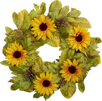This gorgeous harvest wreath provides all the wonderful colors of autumn. A mix of green foliage is the backdrop for beautiful sunflowers and real pine cones. Perfect for hanging or used as part of your Thanksgiving table centerpiece. Product Features: Unlit Mixed foliage, flowers and pine cones Recommended for indoor use - if using outdoors place under a covered area Sturdy twig backing for easy hanging - hardware not included No assembly required – wreath comes in 1 piece Dimensions: 24” diameter (measured from outermost tip/edge to outermost tip/edge across the wreath) Material(s): pine cones/polyester/wire/foam/twigs