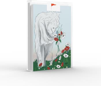 - Artwork features a yeti picking flowers