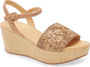 Floral appliqués and woven raffia add boho charm to a lofty sandal set on a chunky platform and integrated wedge heel. A cushioned footbed and adjustable ankle strap offer optimal comfort and a secure fit.