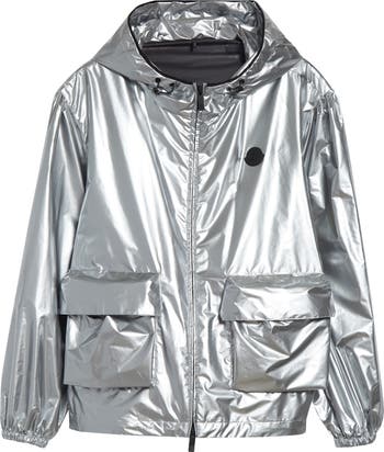 A futuristic metallic finish lends a distinctive look to this nylon-ripstop bomber jacket cut in an oversized silhouette with boxy patch pockets.