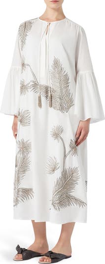 Silvery blooms and sparkling beads elevate an all-cotton dress finished with ruffled sleeves.