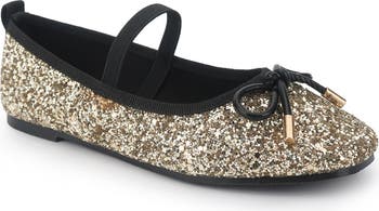 A flood of glitter gives a hefty dose of shine to a metallic ballet flat perfect for the little dancer with a sophisticated eye.