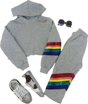 Stylish two-piece jogger set featuring vibrant rainbow sequin accents on the sleeve and pant leg for a dazzling look. Includes a cropped sweatshirt with the uplifting "You Are Amazing" detail and matching high-waisted joggers with an elastic waistband. Perfect for casual outings or showing off your bold and confident style.