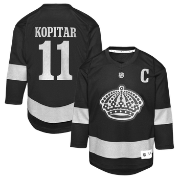 Get your young fan outfitted like their favorite Los Angeles Kings players with this Anze Kopitar Replica Jersey. This officially licensed NHL jersey is crafted from durable polyester to withstand the excitement of every game. Its classic alternate design features screen-printed graphics that showcase your Los Angeles Kings pride, while the sewn-on stripes at the elbows and hem add a touch of authenticity. With its comfortable fit and eye-catching details, this jersey is the perfect way for your young fan to cheer on their favorite player.