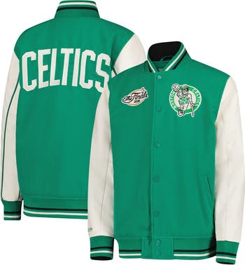 Give your young fan some timeless style with this Boston Celtics Full-Snap Varsity Jacket from Mitchell & Ness. Its retro athletic look features contrasting faux leather sleeves and traditional striped trim. Constructed with a blend of durable polyester and soft viscose, this Boston Celtics jacket provides comfort in a classic design.
