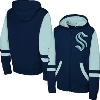 Gear up your young Seattle Kraken fan for game day with this Face Off Full-Zip Hoodie. This hoodie features a contrast-color hood lining that adds a pop of style, while the screen print graphics at the left chest and on the right sleeve let your young fan show off their Seattle Kraken pride. Plus, the fleece lining provides added warmth and a soft feel, making it a comfortable choice for chilly days at the rink or cozy nights at home.