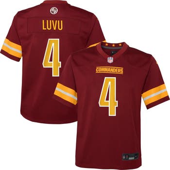 Let your young fan show their excitement for their favorite team with this Frankie Luvu Washington Commanders Team Game Jersey from Nike. This jersey is made from durable, smooth tricot fabric with breathable mesh panels, ensuring your young fan stays comfortable and cool while showcasing their Washington Commanders pride. The vibrant screen-printed name, numbers, and team details make this jersey a standout piece, perfect for cheering on Frankie Luvu and the Washington Commanders.