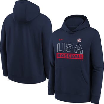 Your young slugger can show their USA Baseball pride during the 2026 World Baseball Classic with this cozy Club Fleece Hoodie from Nike. Perfect for moderate temperatures, this midweight hoodie features brushed French terry fleece lining for breathable warmth, ensuring your kiddo stays comfortable whether they're at the ballpark or playing with friends. The drawstring hood offers adjustable coverage, while the screen print graphics boldly display their USA Baseball spirit. With its standard fit and front pouch pocket, this sweatshirt is a home run for both convenience and comfort.