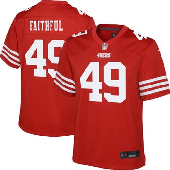 Help your young fan show some love for one of the top players in the NFL with this exclusive The Faithful San Francisco 49ers Game Jersey from Nike. Crafted from durable, smooth tricot fabric, this jersey has a midweight feel that's perfect for showing off their San Francisco 49ers pride. The breathable mesh panels and side vents at the hem will keep them cool and comfortable whether they're cheering from the stands or playing their own game of backyard football.