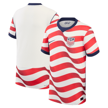 Proudly red, white and blue, the Nike USMNT 2026 Home Authentic Jersey features wavy stripes that remind your team of their flag flying high. This authentic jersey is exactly what the pros wear on the field, built with Nike's Aero-FIT technology and elliptical mesh zones that move air between your skin and the fabric to help you stay dry when the action picks up. The heat-transfer team badge and Swoosh keep the silhouette lightweight and smooth, letting the undeniably American stripes take center stage. With "The Best Of U.S." heat-pressed on the back neck, this jersey is a declaration that the USMNT is ready for its moment in 2026.