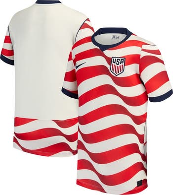 Proudly red, white and blue, the Nike USMNT 2026 Home Stadium Jersey features wavy stripes that remind your team of their flag flying high. Inspired by what the pros wear on the field, this replica kit uses moisture-wicking Dri-FIT technology and breathable mesh side panels to keep you dry and comfortable whether you're in the stands or on the street. A sewn-on woven team badge and an embroidered Nike Swoosh give fans the stitched-with-pride finish they are looking for. With "The Best Of U.S." heat-pressed on the back neck, this jersey is a declaration that the USMNT is ready for its moment in 2026.