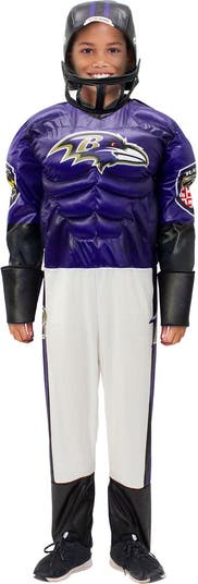 Transform into a true Baltimore Ravens player for Halloween or dress-up with this Game Day costume that celebrates human superpowers. The bodysuit features padded faux muscles, official Baltimore Ravens graphics and hook-and-loop closures for adjusting the size. Plus, polyester material creates a soft feel for hours of comfortable wearing.