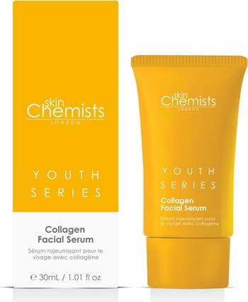 skinChemists Youth Series % Collagen Facial Serum ml For Smoother, Younger-Looking Skin – Your Essential Skincare Boost Struggling with fine lines and wrinkles? Our Youthful Radiance Collagen Serum is expertly crafted for all skin types, especially those seeking to enhance natural collagen production and achieve a smoother complexion. Infused with potent plant-based actives, this luxurious serum deeply hydrates, nourishes, and repairs, delivering a youthful glow. What It Does: Supports collagen production for firmer skin Reduces the appearance of lines and wrinkles for a youthful look Maximises hydration and nourishment for a plump feel Fast-absorbing formula, perfect for layering under moisturiser The Solution: Fine lines? Our serum helps restore youthful smoothness. Dull skin? Experience deep hydration for a radiant glow. Loss of elasticity? Enjoy a firmer, more resilient complexion. How to Use: Apply - drops onto clean, dry skin morning and evening. Follow with your favourite moisturiser for optimal results. Why You'll Love It: Suitable for all skin types, including sensitive Vegan, cruelty-free & free from parabens, sulfates & artificial fragrances Shop now and experience the difference! Apply our Collagen Facial Serum to clean, dry skin after cleansing, both in the morning and evening. This powerful formula supports collagen production, reduces lines and wrinkles, and provides deep hydration and nourishment for smoother, younger-looking skin.