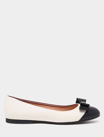 This Ysla ballet flat features a white leather upper with a black toe cap trimmed by a Bally Bow. The rubber sole and Bologna construction ensure step-in comfort.