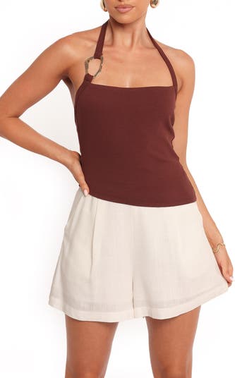 Chic goldtone hardware makes a statement accent on the halter neck of a stretchy and trim rib top that's finished with a contemporary asymmetric hem.