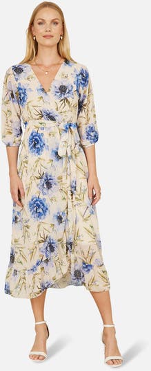 This floral style dress is perfect for wearing to weddings or the races this season. In a wrap over style that is super flattering, the tie belt at the waist creates shape whilst the flowy frill hemline adds to the flirty and feminine feel. With 3/4 sleeves to keep off the chill in the spring - We love this paired with a bolero and stylish heels.