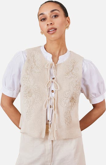 Soft hand, sculpted sleeveless silhouette, romantic floral embroidery, tie-front closure for graceful daytime layering.