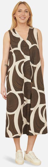 The oversize abstract circle print takes over the entirety of this relaxed fit trapeze style dress. The crossover neckline compliments the easy draped shape. The Midi length looks perfect styled with sandals or trainers,