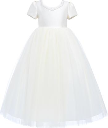 The Yvette dress is designed for a refined and timeless look. This stunning dress is crafted in a beautiful ivory hue that exudes sophistication and grace. The delicately accented neckline adds a subtle yet captivating detail, elevating the dress’s simple beauty with a touch of charm.