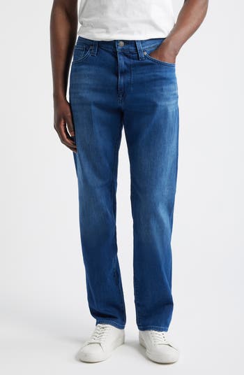 These classic straight-leg jeans are made from soft stretch denim in a faded dark wash that can go casual or elevated.
