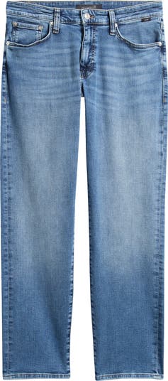 Deep sanding and whiskering bring instant old-favorite status to versatile straight-leg jeans cut from soft stretch denim.