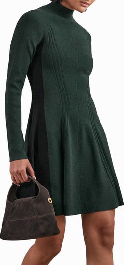 A skater silhouette adds cheery flounce to a verdant sweater dress accented in ribbed details.