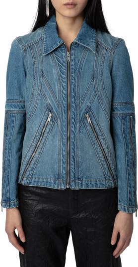 Swooping curves and angles add a supercool geometry to weekend-ready jacket cut from sturdy cotton denim.