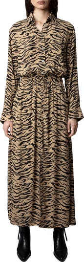 Feel extra fierce in this maxi length shirtdress featuring allover tiger print and a flattering drawstring waist for flattering definition.