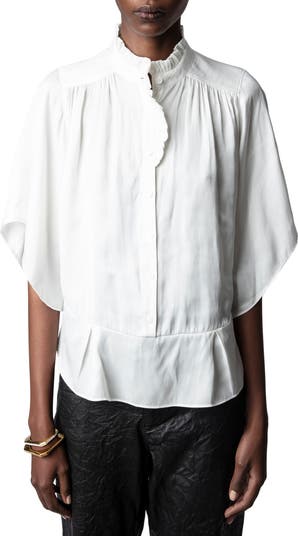 Romantic ruffles adorn this satiny blouse that's sustainably made and framed by elegant, wing-like sleeves.