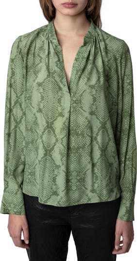 Python scales are replicated in the tonal print of a high-low popover blouse with an easygoing, untamed feel.
