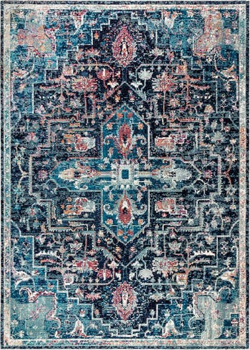Deep, vibrant color and intricate pattern make our Zafra rug a lively addition to your home. The center features a deep navy medallion decorated with stylized vines and flowers in faded coral. Varying shades of peacock blue in the background give this rug a vintage look.