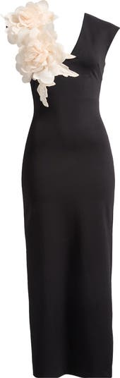 A lavish floral embellishment romances this elegant sleeveless gown made with a plunging neckline and a figure-skimming silhouette.