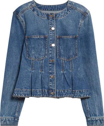 Do denim jacket day differently in an all-cotton option turned to the perfect fade and pleated into a peplum finish.