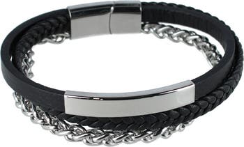 - Features triple strand design: braided leather, smooth leather, and chain link