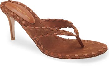 A Moroccan weave technique using a soft strip of leather distinguishes this suede thong sandal handmade in Italy with a steep heel.