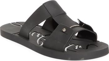 This casual slide sandal features a wide band adorned with a metal piercing to bridge the straps and is completed with a pop of signature red flashing under each step.