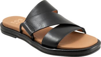 Wide, crossing straps bring a modern feel to this slide sandal featuring a padded leather footbed that ensures every step is comfy.