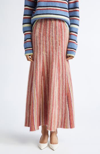 Known for his playful approach to knitwear, Henry Zankov makes sweater weather feel fresh and fun with this colorfully striped skirt knit from a delightfully fuzzy mohair blend enriched with soft alpaca yarns. Shaped by soft godets, this dramatically flared skirt takes style cues from the wardrobes of Zankov's fall '25 muses—'60s New York icons Nico, Edie Sedgwick and Candy Darling.