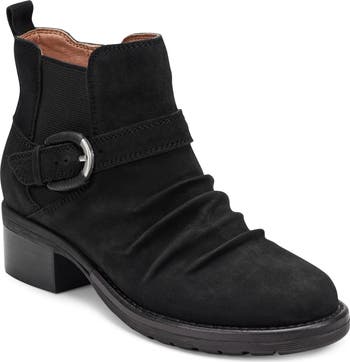 Chic style and lasting comfort beautifully combine on this everyday bootie showcasing a strap-detailed ruched upper set on a cushioned footbed and flexible sole.