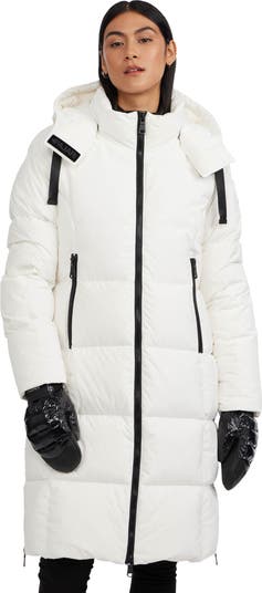The Pajar Zaniah long puffer features a full front zipper, side pockets, and elongated side vents for enhanced movement. Its adjustable hood, cozy rib knit storm cuffs, and channel quilt design offer a stylish and functional puffer jacket, with water-repellent properties and insulation designed for temperatures as low as -20°C (-4°F).