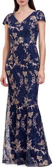 Bring elegance to your special occasion in this mermaid gown designed with shimmering metallic embroidery and slight sleeves.